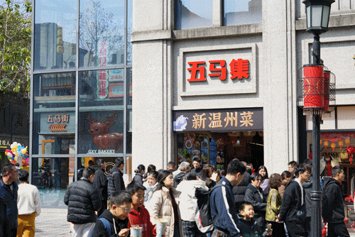 相传东晋时期,书圣王羲之曾任温州太守,出行时常乘坐五匹马拉的马车,百姓争相围观,后来就把这条街叫作五马街。今年恰逢马年,街区里的“马元素”成了最受欢迎的打卡地:街头的马年打卡装置、巷弄里悬挂的马型气球、街心的“五马奔腾”铜像前围满了合影的市民游客,大家争相在马年沾沾“马”上好运。