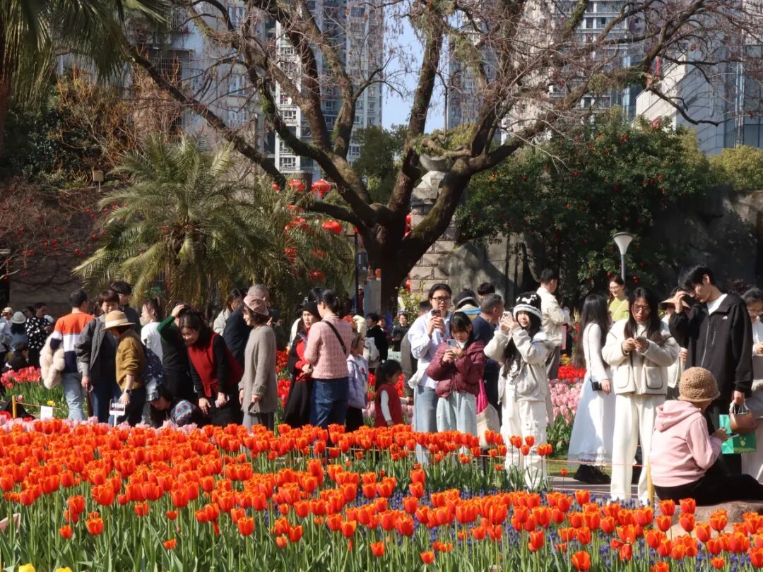 据介绍,今年郁金香开花较往年提前了7至10天,目前北入口主展区花开已逾七成,即将进入最佳观赏期。春节以来,园内人流量节节攀升——从大年初一的9000余人次,到大年初四突破2万人次,热度持续走高。