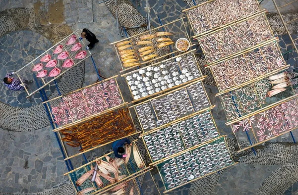 顺着公路骑行,海风凉丝丝的刚好提神。到东岙村不妨先歇歇脚,在充满烟火气的早市里美美吃上一顿。吃饱了再逛村庄,特色石厝错落有致,海边沙滩柔软绵细,不远处的晒场上,竹匾里摊着鱼干、虾干等,在阳光下泛着自然的光泽,随手一拍就是原汁原味的海岛风情。