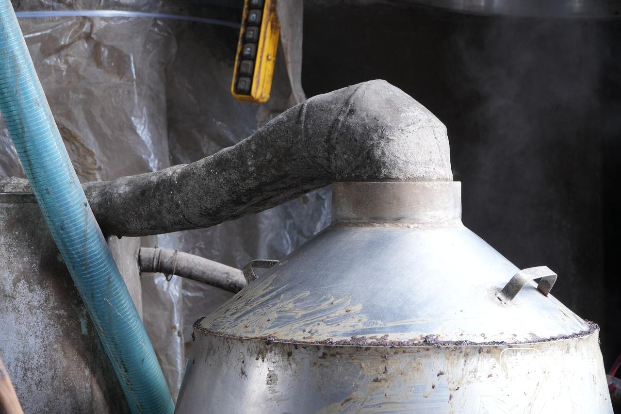 为了让记者了解人家烧,胡晓敏特意为记者展示了“烧酒”这一步骤,并展示了手上一辈辈传下来的酿酒老物件。烧酒通过特制的管道,从蒸汽冷却转化成白色的烧酒,流入陶坛中,“我们还要时刻关注酒精度数。”