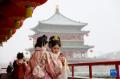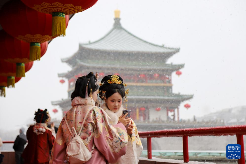 新春伊始,我国部分地区出现降雪天气。2月23日,游客在陕西省西安市钟楼旁赏雪拍照。新华社发(薛刚摄)