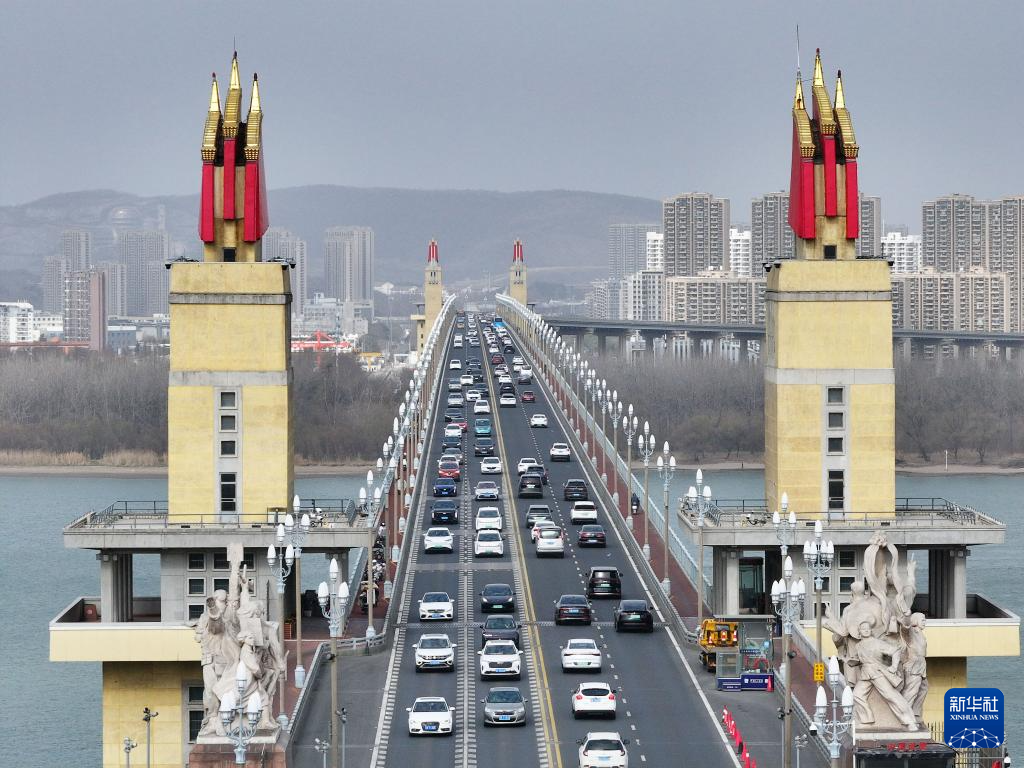 这是2月23日拍摄的南京长江大桥上的车流(无人机照片)。新华社发(刘建华 摄)