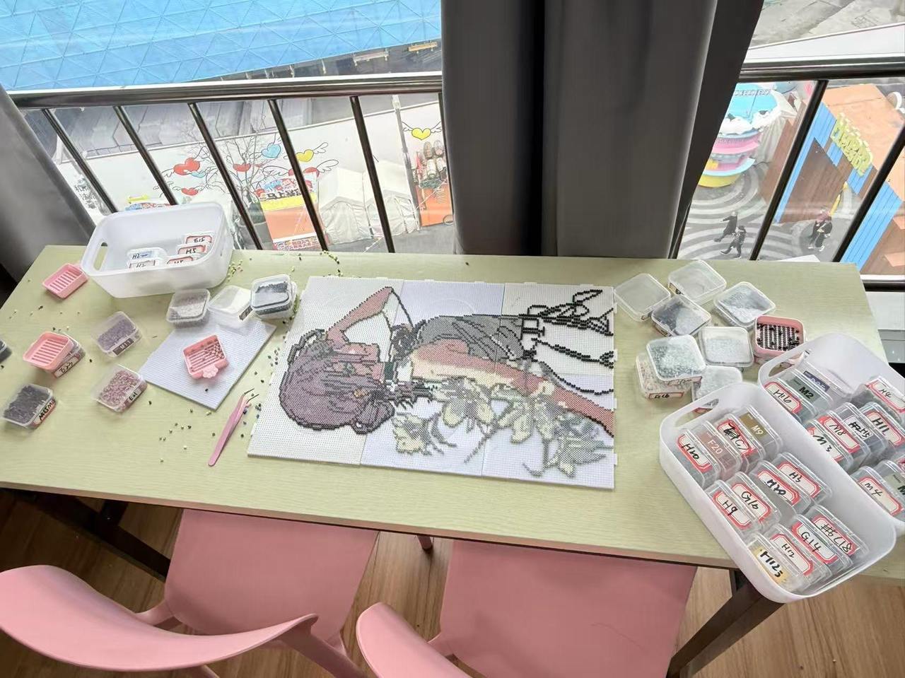 在店内靠窗的位置,一幅拼了一大半的作品躺在桌上。蒙蒙指了指那幅图,“这位顾客已经连续拼了三天,今天应该还会来收尾。”她解释,因为作品太大,需要多个模板拼接,顾客担心拼好的部分散落,就留在店里请店员帮忙照看。