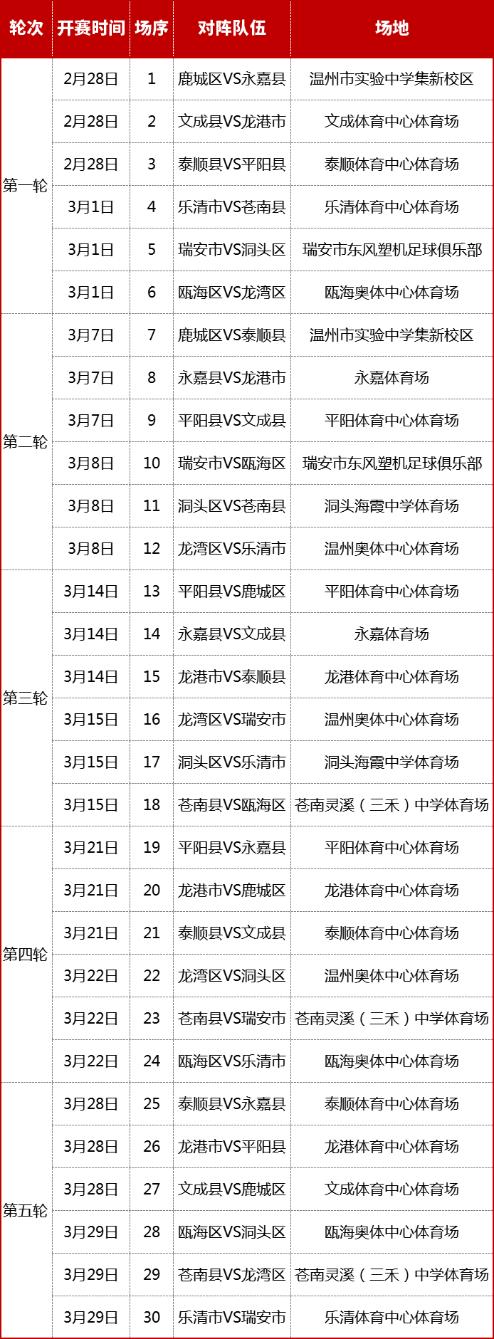 温州网讯 温州市首届瓯越足球冠军联赛(简称“瓯冠”)县(市、区)争霸赛即将于本周末打响,前两轮比赛开球时间均为14时30分。首轮对阵形势分别为:A组,2月28日14:30,鹿城VS永嘉、文成VS龙港、泰顺VS平阳;B组,3月1日14:30,乐清VS苍南、瑞安VS洞头、瓯海VS龙湾。