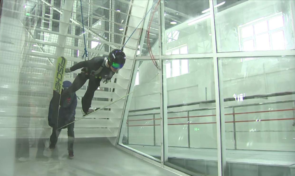 运动员在国家跳台滑雪训练科研基地的风洞实验室内训练。