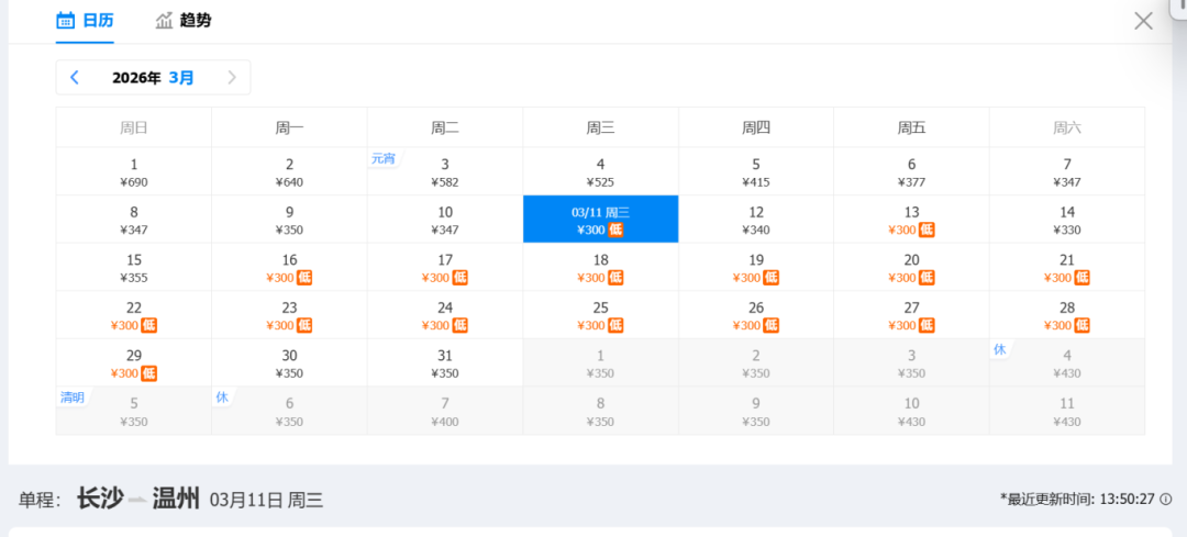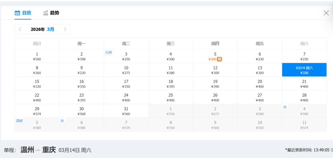 去程低价:200元(3月14日)