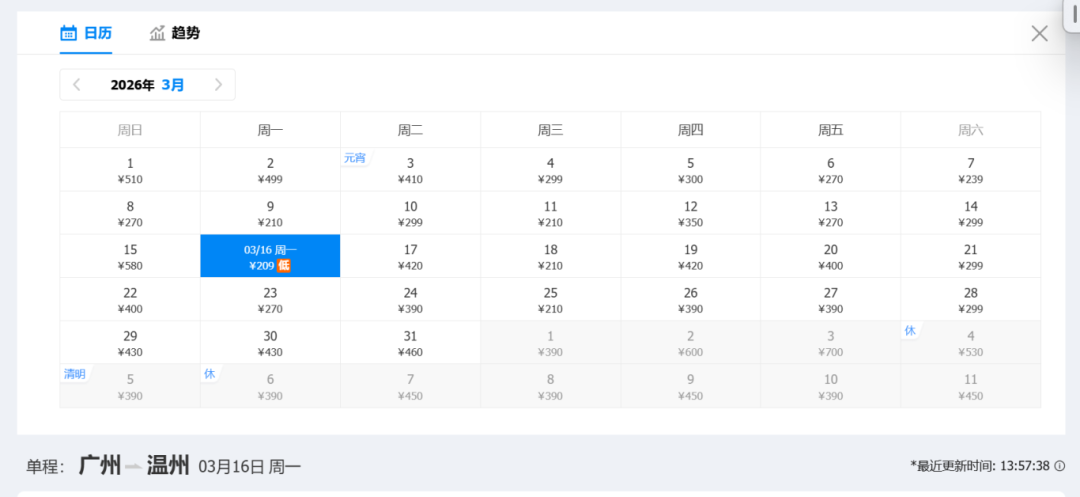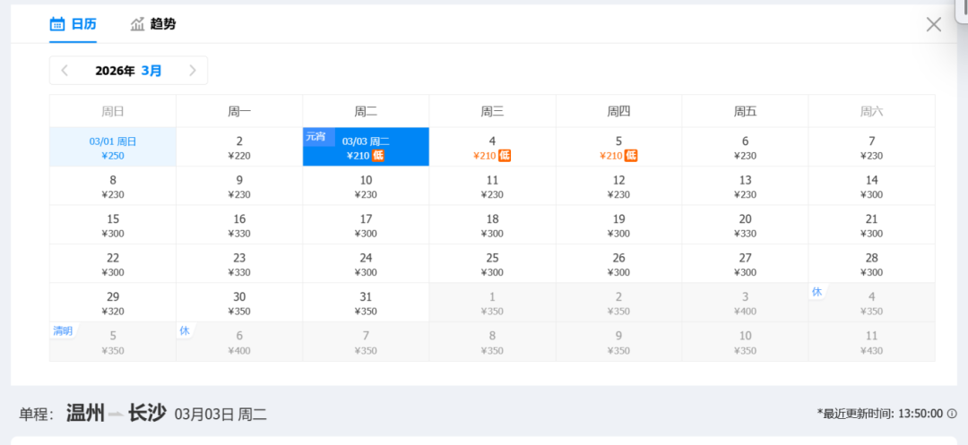 去程低价:210元(3月3日)