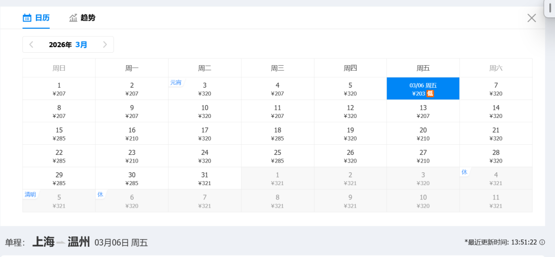 返程低价:203元(3月6日)
