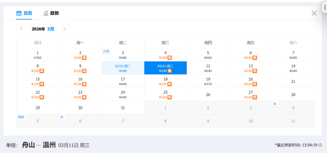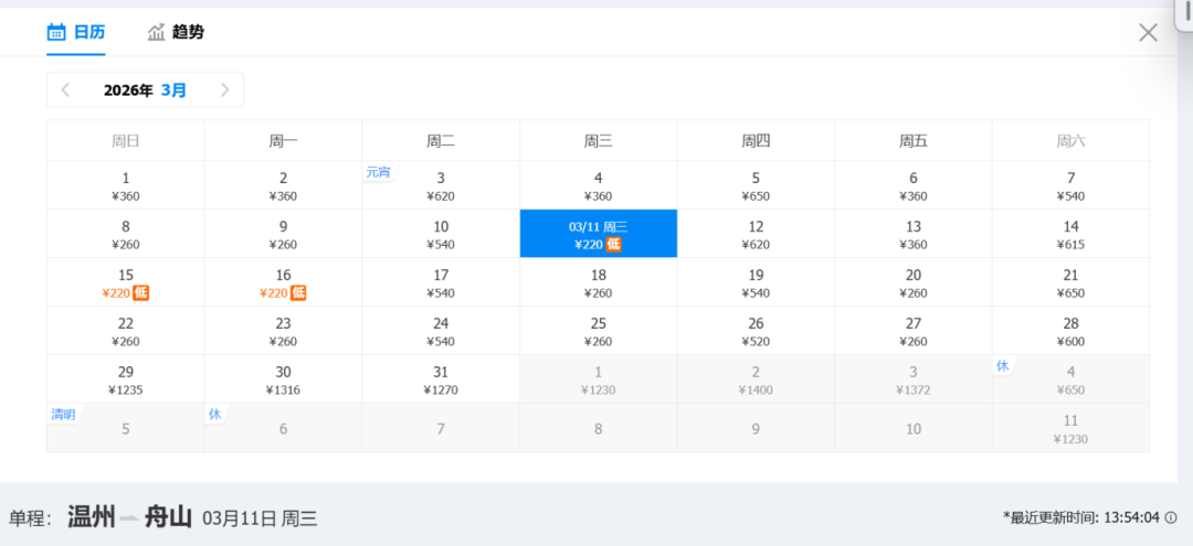 去程低价:220元(3月11日)