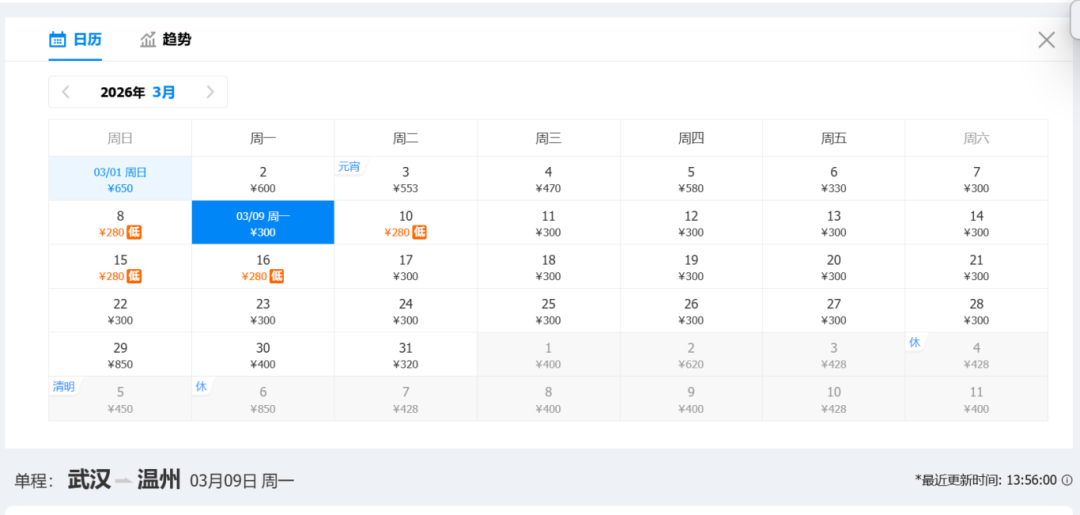 返程低价:280元(3月8日)