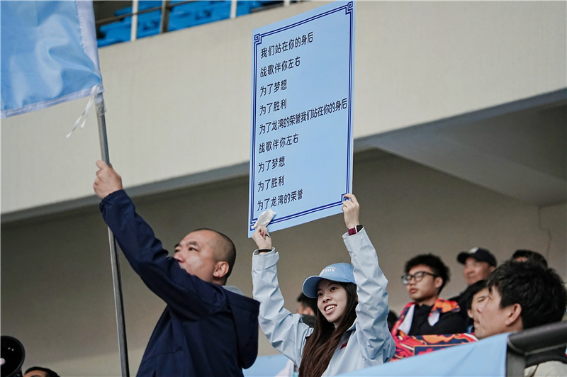 赛场上,两队球员拼抢激烈,赛场外,龙湾球迷高举“为了龙湾荣誉”的蓝色标语,与瓯海拥趸挥舞的红色大旗在雨幕中交相辉映,双方助威团在雨中不遗余力地呐喊,为两队球员注入强劲动力。