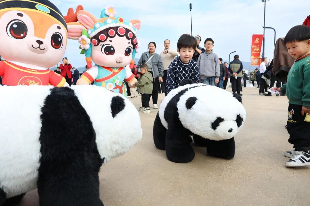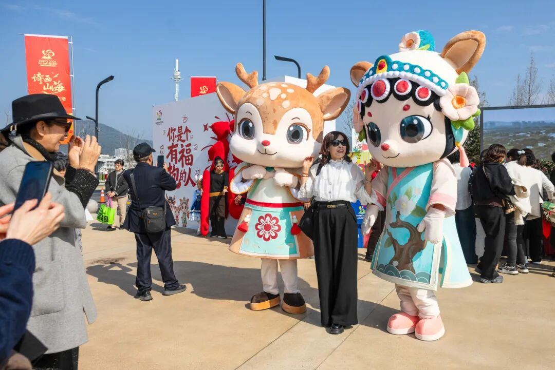 同样吸引市民驻足观赏的,还有吉祥物“瓯宝家族”。正值开园期间,主办方特地组织吉祥物巡游,走进市域轨道S1线站点、市区五马街等地,憨态可掬的人形玩偶鹿爸爸“喧喧”、鹿宝宝“呦呦”和鹿妈妈“榕榕”,一身戏服装扮,欢快地和大家打招呼。