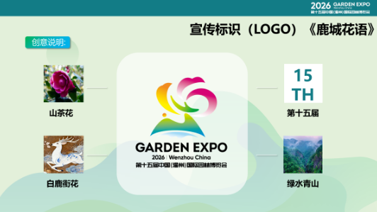 像一只鹿奔跑在山水园林里……这是此次园博会的宣传标识(Logo)《鹿城花语》,嵌入在连接温州园博园南园和北园的“云翼飞虹”人行景观桥上,醒目亮眼,吸引过往游客打卡拍照。这部作品作者刘俊峰介绍,该LOGO以温州“市花”山茶花为视觉主体,以鹿的头部设计构成数字“15”,点明“第十五届”园博会。“我虽没去过温州,但认识很多温州人,他们‘敢为天下先’的精神让人印象深刻,奔鹿形象展现了温州的蓬勃活力。”