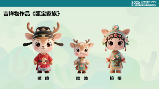 “瓯宝”名称,源自温州古称“瓯”,“白鹿衔花”是源自东晋的建城传说,选择“鹿”作为吉祥物,契合温州深厚历史文脉。它们的名字分别取自唐代诗人郑谷诗句“饮涧鹿喧双派水”、《诗经》“呦呦鹿鸣”,以及温州的市树“榕树”。它们的服饰融入温州南戏元素,是对温州作为“南戏故里”的致敬。