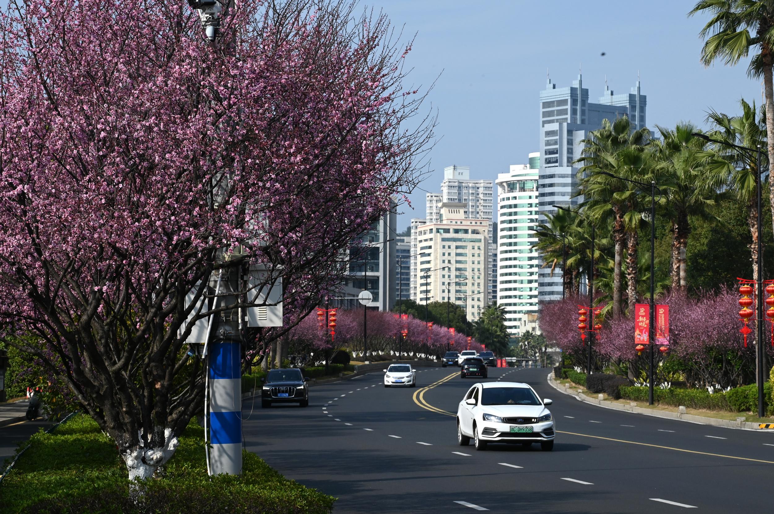 如果你最近经过鹿城区府东路,一定会被眼前的景象惊艳到——道路两旁的美人梅正值盛花期,粉红色的花朵密密匝匝缀满枝头,形成一条绵延的粉色隧道。