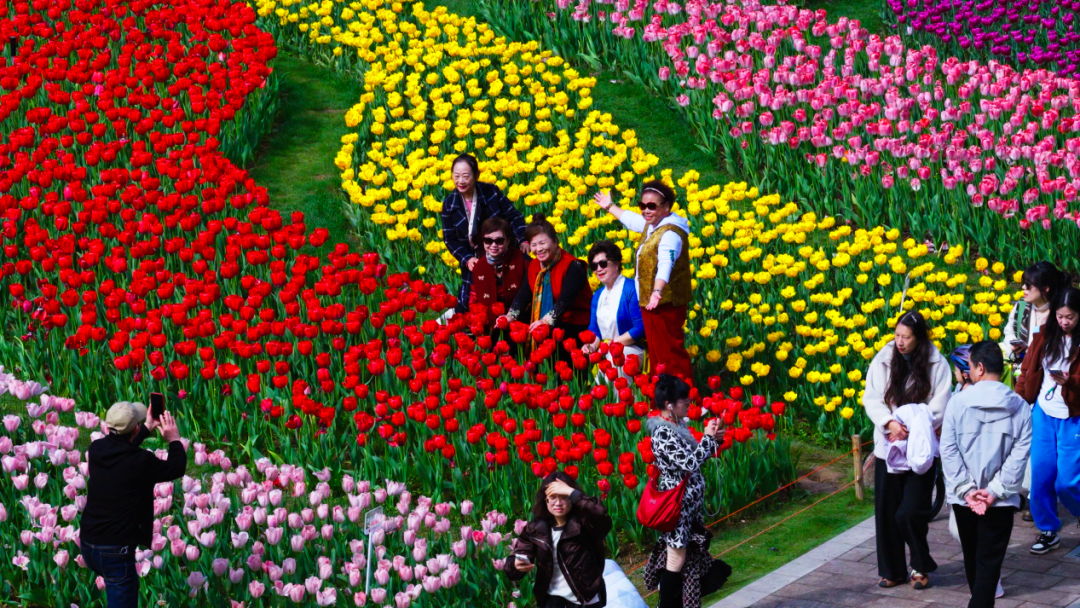 走进马鞍池公园,75个品种27万株郁金香交错排布在公园各处,与洋水仙与风信子以及花葱等各色花卉共同织就满园春色。
