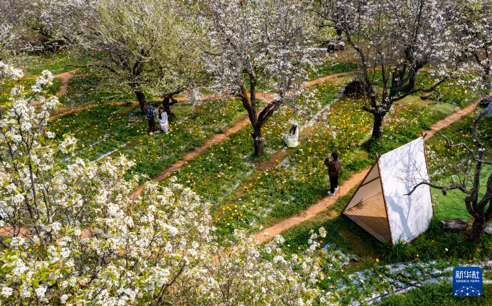 3月10日,游客在昆明名花谷游玩(无人机照片)。