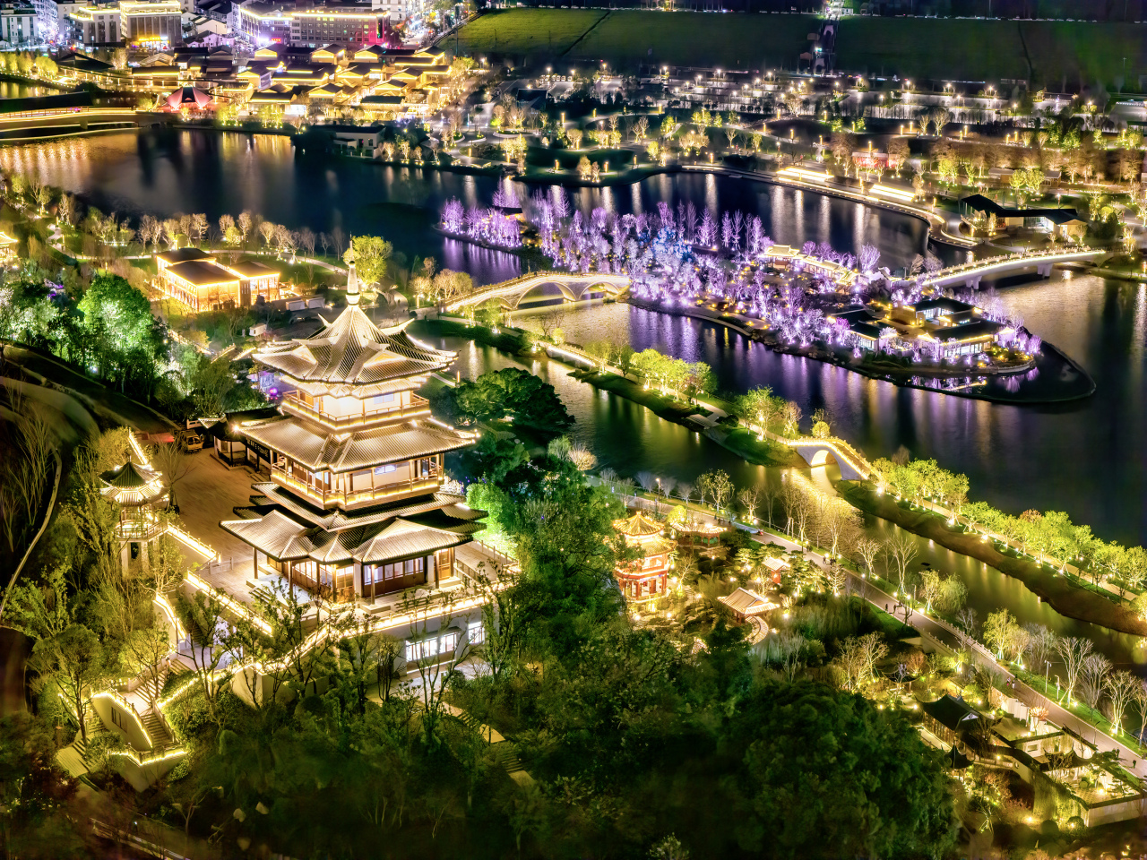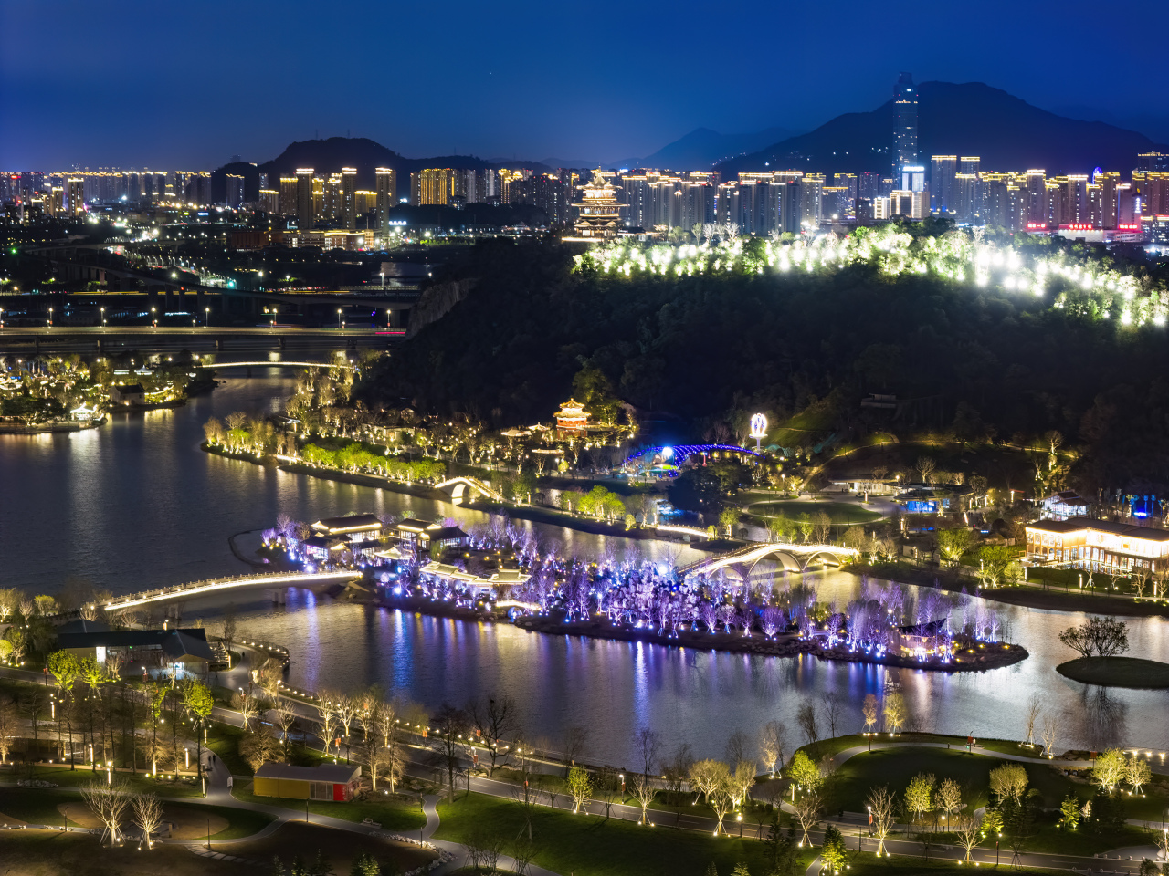 本次园博园亮化提升工程全面覆盖南园、北园两大核心片区,统筹实施景观照明、建筑照明、桥梁照明三大重点项目。图为温州园博园北园