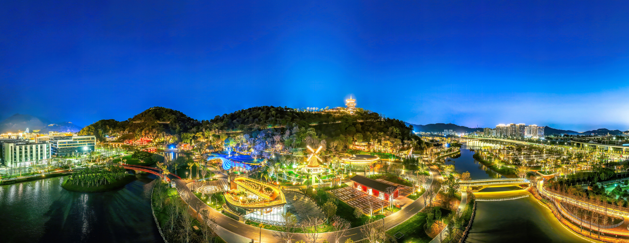 未来,游客不仅可在白天游览园林美景,更可在夜幕降临时,沉浸于光影交织的山水诗境之中,感受“灯火璀璨展园林夜韵”的独特魅力。图为浙山浙水展园