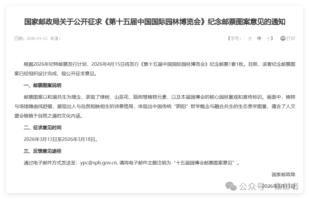 根据2026年纪特邮票发行计划,2026年4月15日将发行《第十五届中国国际园林博览会》纪念邮票1套1枚。目前,该套纪念邮票图案已经组织设计完成,现公开征求意见。