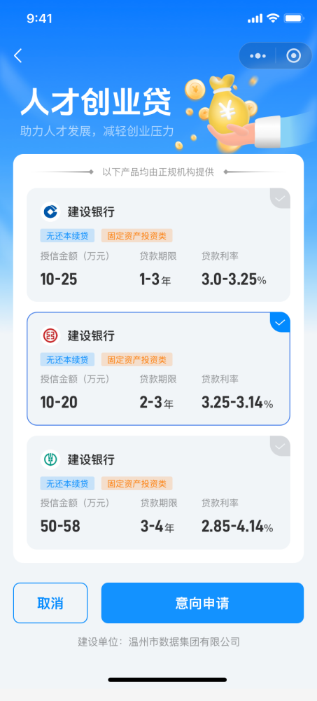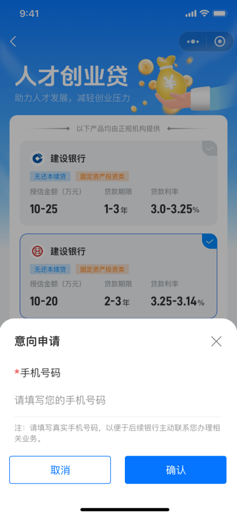 人才完成分类认定后,通过微信扫码,即可在线上专区一站式查看多家银行定制的预授信方案,包括额度、利率、期限等,可自主选择最适合的产品,最高授信可达2000万元。