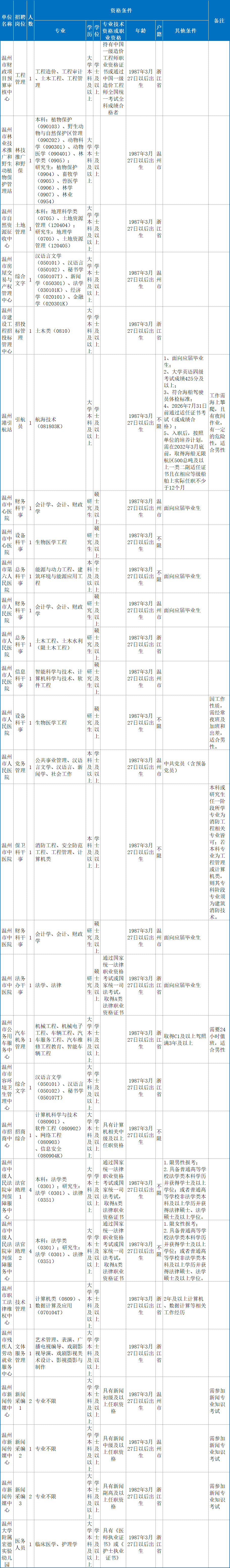 (一)用人单位、具体岗位及要求详见《2026年温州市市级事业单位公开招聘工作人员岗位一览表》。