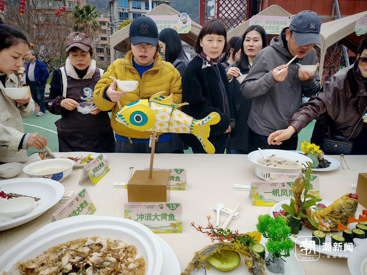 中午时分,备受期待的“花海黄鱼宴”正式开席,舌尖上的满足感与春日美景同步上线。独具特色的鹿西黄鱼·渔家厨娘厨艺赛吸引了大家的关注。冲浪大黄鱼、家烧大黄鱼……锅铲翻飞间,一道道鲜香的大黄鱼呈现在游客面前。“真是鲜美,这就是海洋的味道。”来自温州市区的周雨桐品尝后说道。