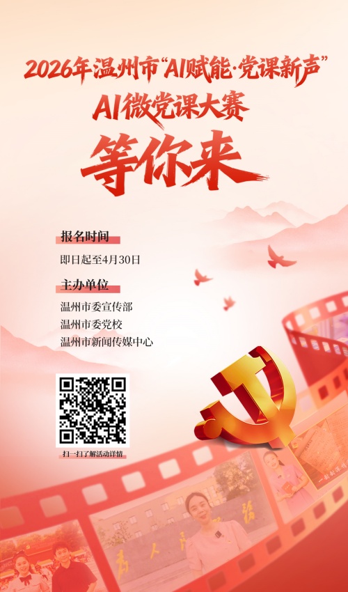 温州网讯(记者 张湉)为创新理论宣讲形式、激活党员教育数字化新动能,推动党的创新理论深入人心,近日,由温州市委宣传部、温州市委党校、温州市新闻传媒中心联合主办的2026年温州市“AI赋能·党课新声”AI微党课大赛正式启动。大赛依托人工智能技术,打造新型党课传播模式,讲好温州高质量发展故事,引导全市党员干部树立和践行正确政绩观,凝聚思想共识与奋进力量。