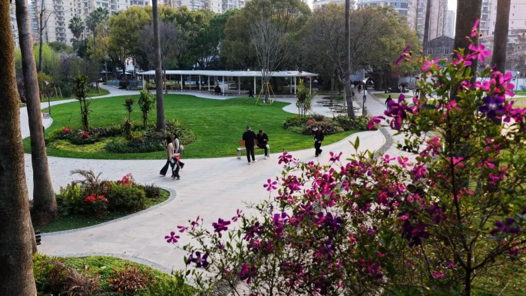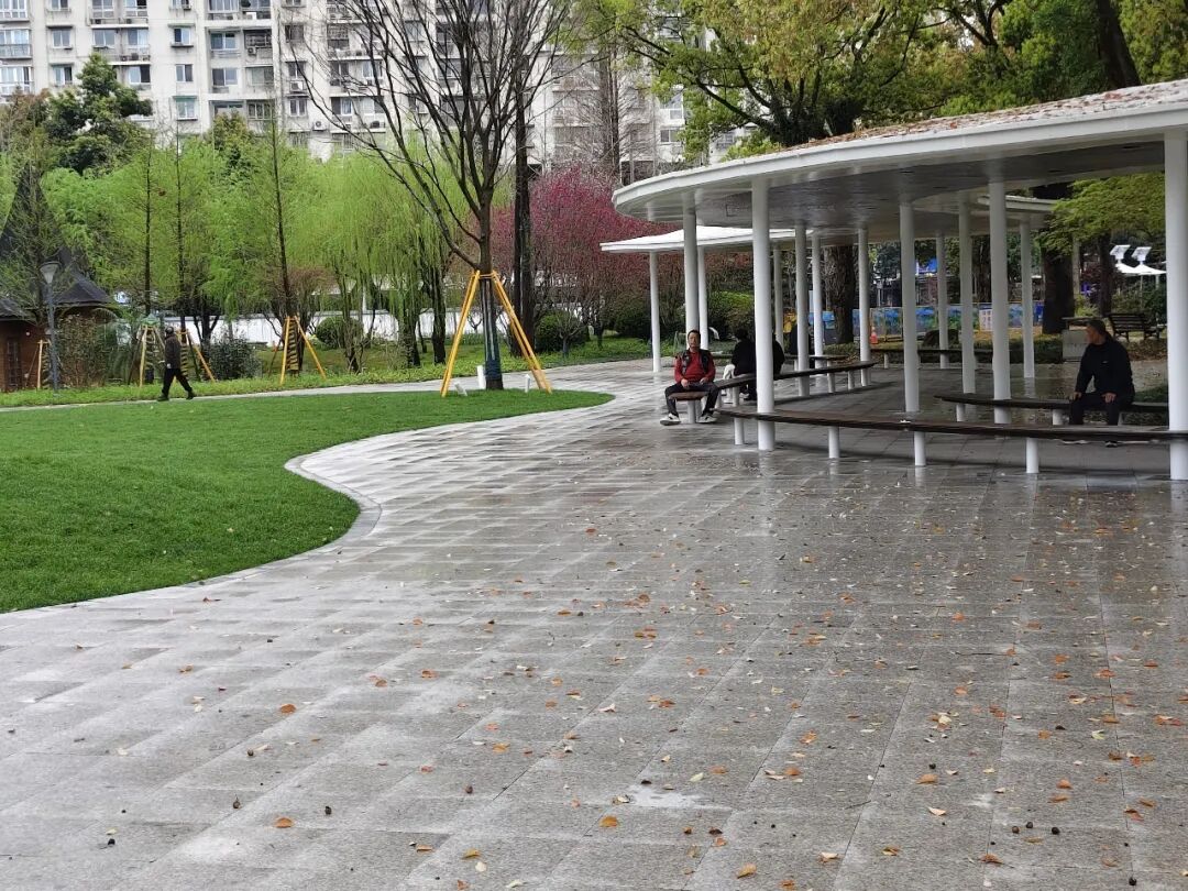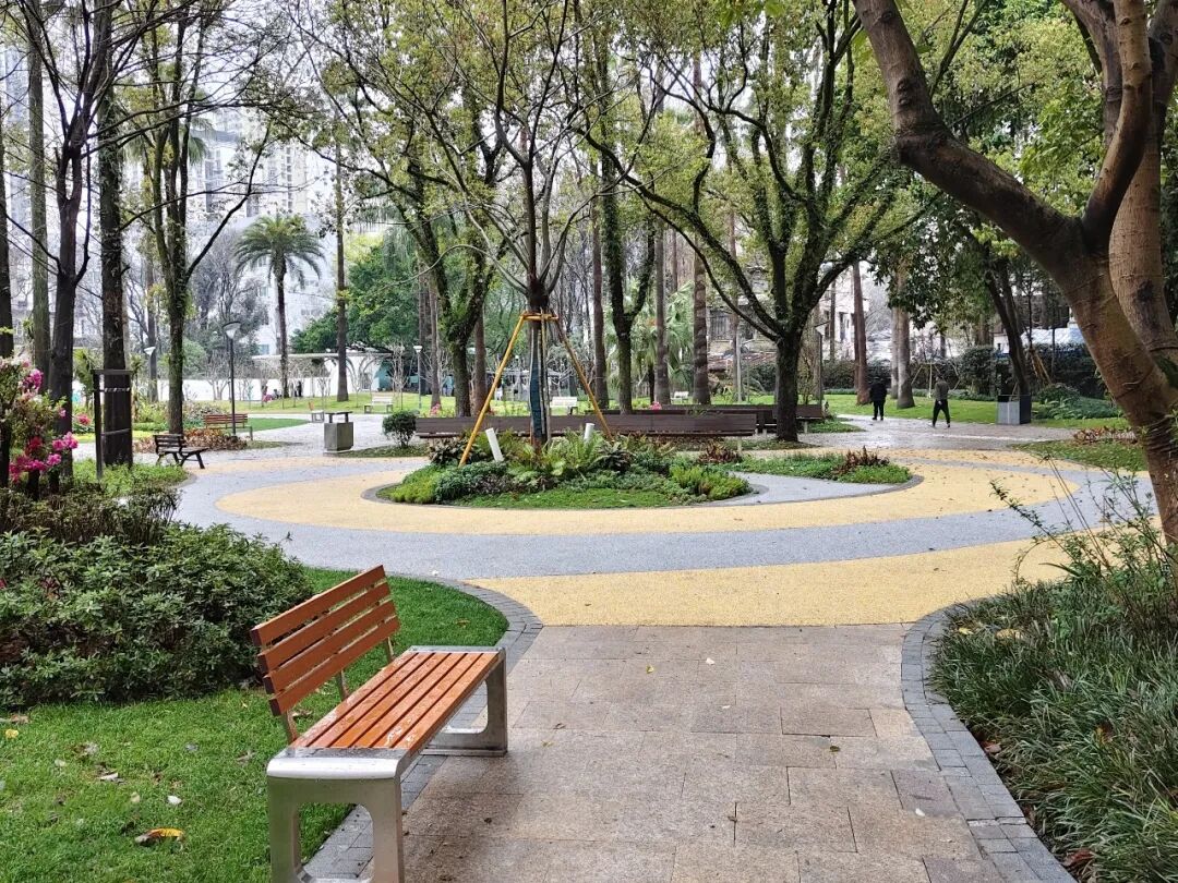 园路铺装全面更新:原本破损不平的路面被平整舒适的新铺装取代,散步、推车、轮椅通行都更加顺畅。
