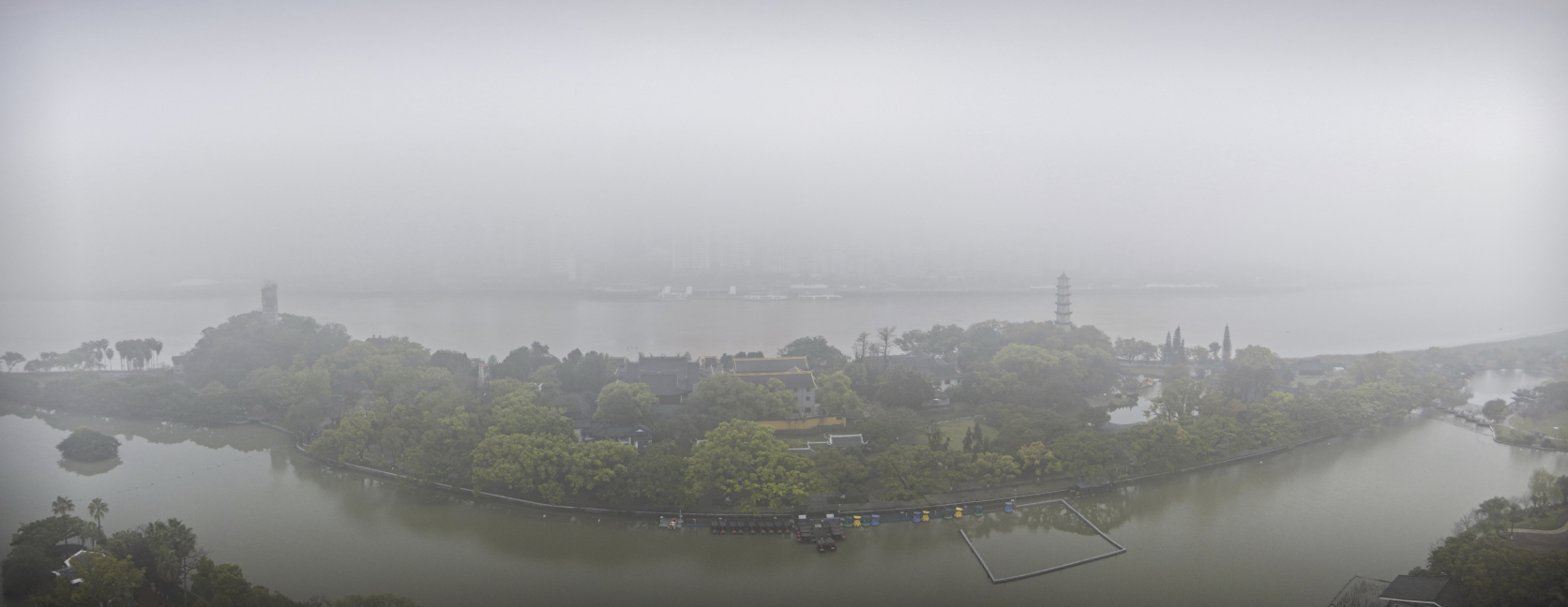 江心屿双塔在薄雾中若隐若现,对岸的朔门古港遗址则被浓雾笼罩,难辨轮廓。摄影: 苏巧将
