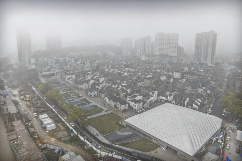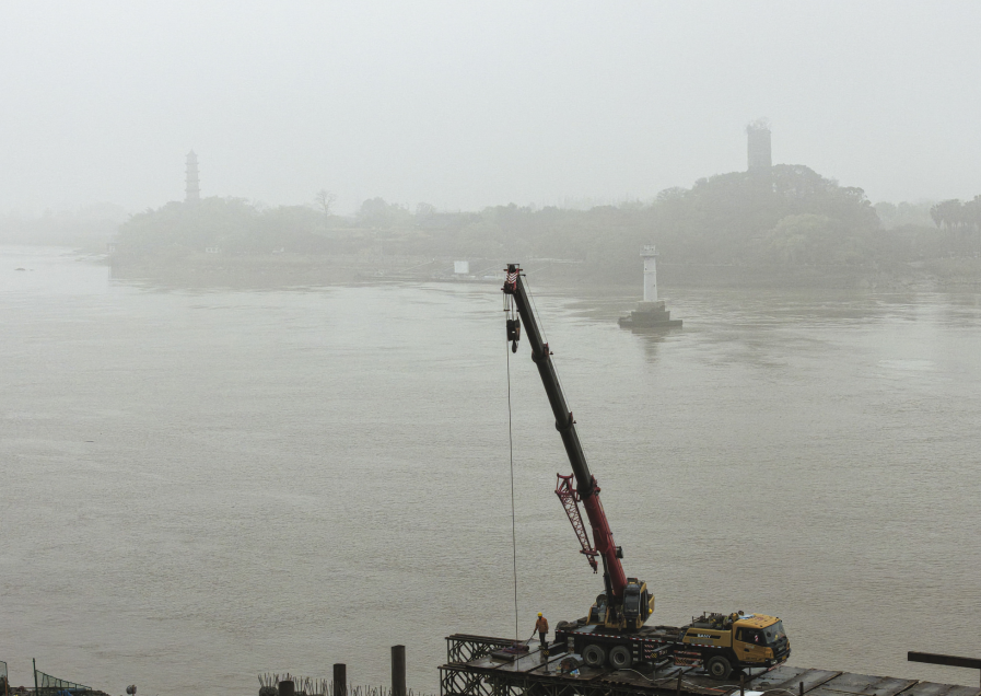 工人在朔门古港遗址处施工,远处的江心屿在大雾中若隐若现。摄影: 苏巧将