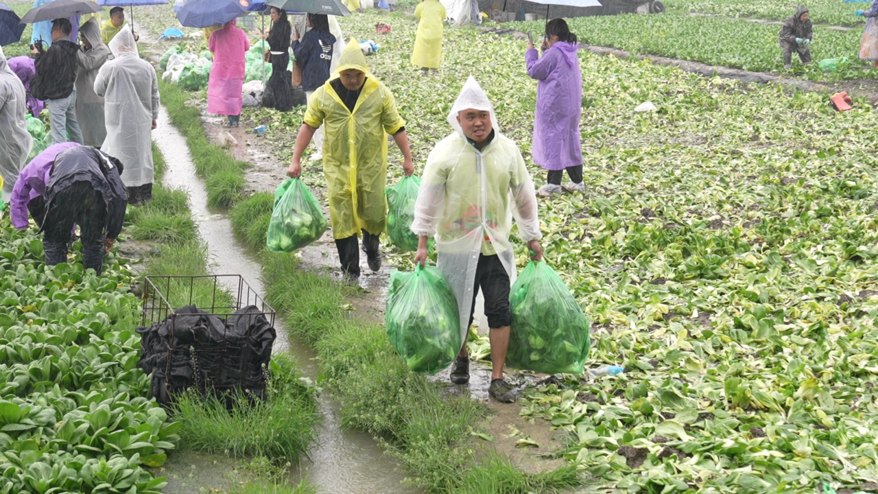 温州永丰超市生鲜采购部总监助理唐宗勤,早上6点多就带着20多名员工赶到地里。“昨天看到新闻后,我们第一时间取样检测,青菜各项指标均合格。”他们自备货车、菜筐,抵达后立刻投入采收。“大雨天,几名员工滑倒摔了,但大家依旧坚守岗位。”唐宗勤说,只要条件允许,超市愿意把剩下的青菜全部收购。