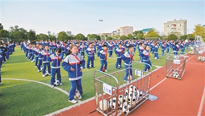 奔跑、传球、射门……每天上午大课间的音乐声音一响,洞头区灵南小学的孩子们便自主排成方阵跑动到操场,区别于其他学校的跑操,该校将直线运球、踩球、传接球等技能巧妙融入跑操环节,一下子操场便成了足球乐园。