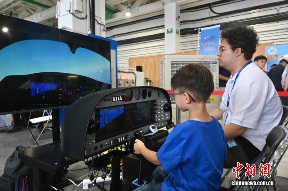 图为一名男孩(左)进行定翼机模拟飞行体验。记者 李志华 摄