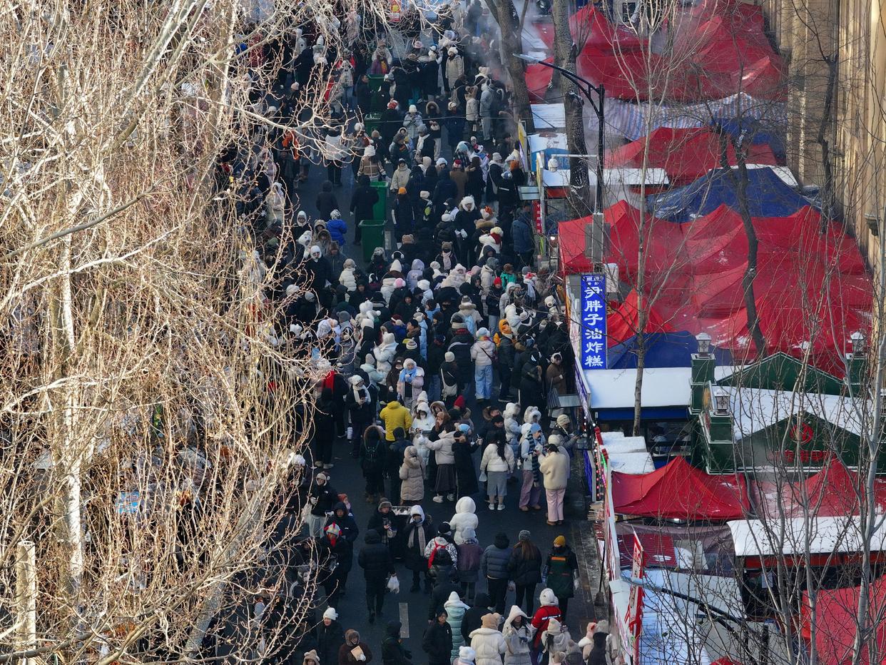 1月14日,哈尔滨市道里区红专街早市人流熙攘(无人机照片)。新华社发(张树 摄)
