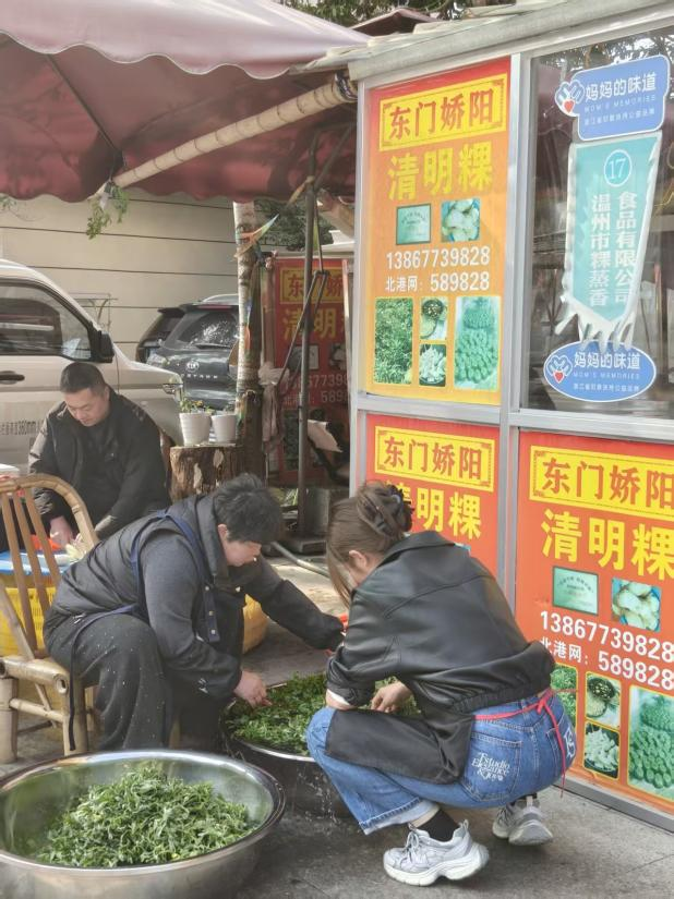 这份清明粿生意到传到陈娇阳手里已是第三代,老手艺、老配方始终没变,留住了最地道的平阳风味。每年从正月开始,店里的生意就闲不下来,随着清明临近,这口“糯叽叽”也迎来一年中的高光时刻。节前最忙碌时,陈娇阳需要发动周边十多位阿姨从早到晚赶制,每天最多要做出400公斤清明粿,才能按时完成订单量。这不仅让老手艺得以延续,也带动周边村民就业,成为当地乡村振兴的生动缩影。