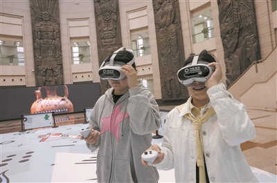 市民戴上AR眼镜,观看沉浸式数字展览《有趣的甲骨文》,“走进”这段历史空间,体验中华文明的魅力。 郑鹏 摄