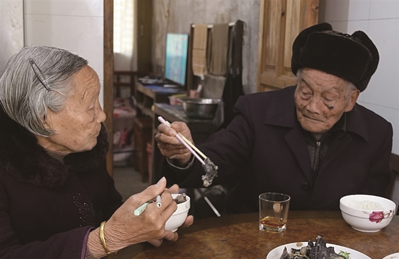 郑爷爷出生于1925年,比金奶奶大两岁,两人育有四子二女,如今四世同堂,六十余口人,家庭和睦。在表山村,这对百岁夫妻的感情一直令乡亲们交口称道。