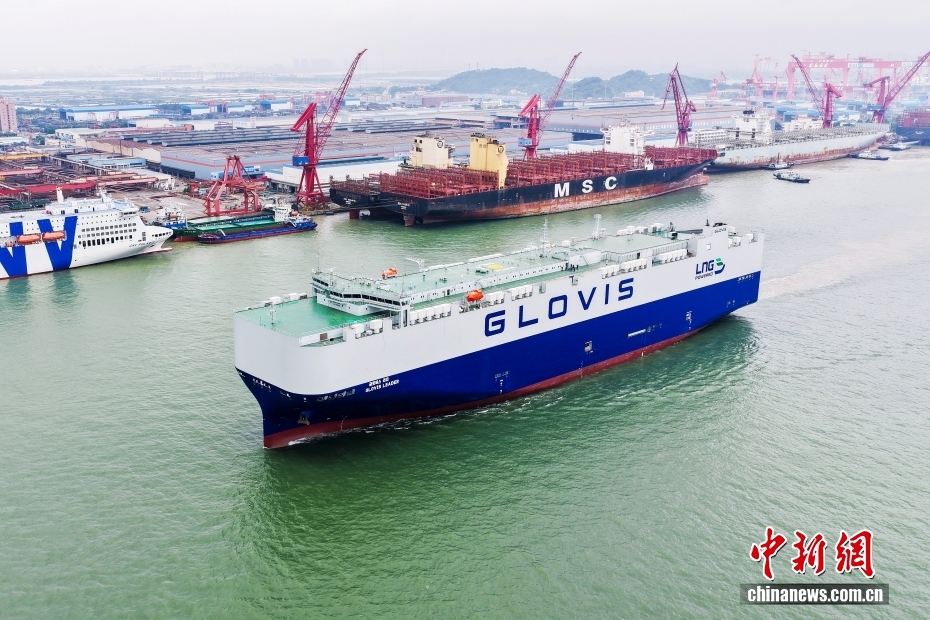 3月31日,中船广船国际为韩国HMM公司建造的10800车LNG双燃料汽车运输船(PCTC)1号船从广州南沙出海试航。该船是目前全球在建的首艘万车级双燃料汽车运输船,全船共有14层汽车甲板,可灵活装载电动汽车、氢能源汽车及重型卡车等多元车型,单船最大装车量达10800辆。(无人机照片)
