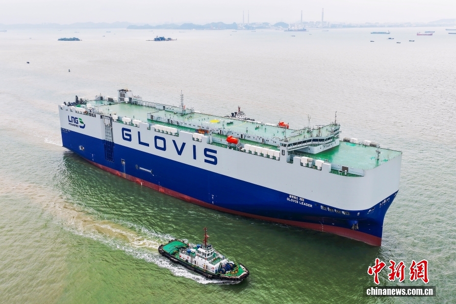 3月31日,中船广船国际为韩国HMM公司建造的10800车LNG双燃料汽车运输船(PCTC)1号船从广州南沙出海试航。该船是目前全球在建的首艘万车级双燃料汽车运输船,全船共有14层汽车甲板,可灵活装载电动汽车、氢能源汽车及重型卡车等多元车型,单船最大装车量达10800辆。(无人机照片)钟伟 摄