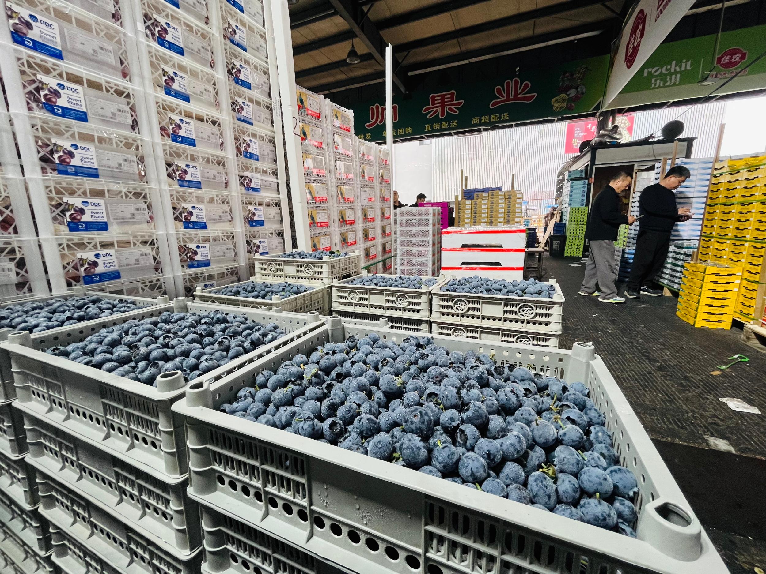 “最近一天能走2600箱。”在温州水果批发交易市场经营了20余年的商户周相忠,一边查验着刚到货的蓝莓,一边向记者介绍。身后,叉车穿梭往来,一箱箱色泽深蓝、果肉饱满的蓝莓从货车上卸下,源源不断运往他的摊位。摊位前,采购商三三两两围聚,询价声此起彼伏。