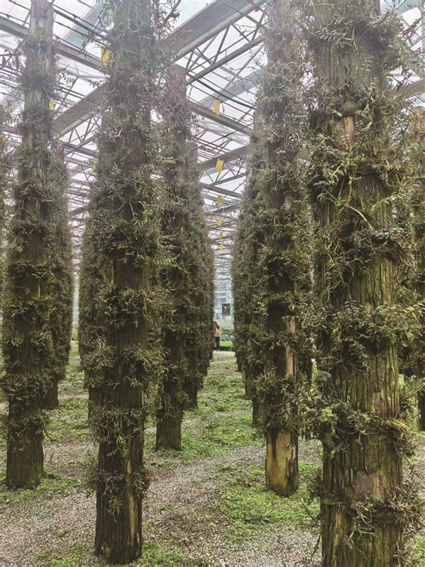 在2号5G智慧温室,由240根杉木组成的仿生树阵格外吸睛。树干上种植的是温州本土的道地药材——铁皮石斛。近年来,原野集团引入高级科研人才,加大对多种“林下经济”药食同源植物的研究,研究团队与欧美专家联合共建AI生物智能育种平台。以石斛为例,通过对石斛的基因组测序,结合AI大模型数据分析,在幼苗期就预测出它未来开花的时间、花朵的形态、甚至石斛多糖的含量,把选育周期缩短了将近三分之二。