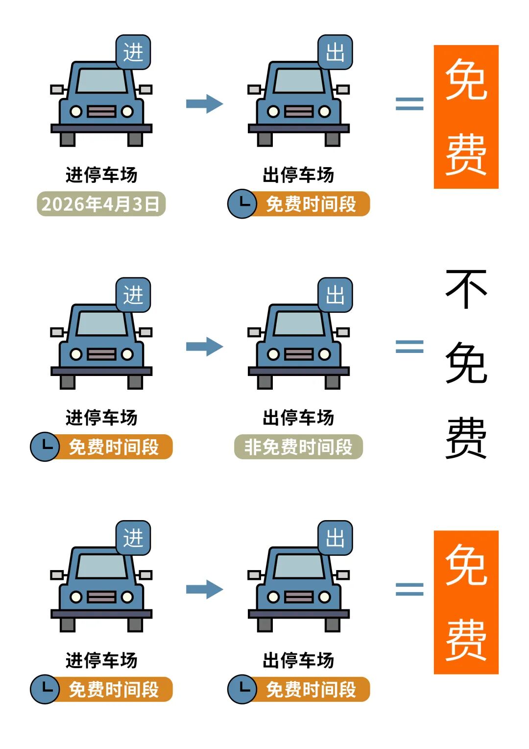 小贴士:免费时段内进场并离场的车辆,享受全额免费;若车辆在免费时段结束后仍未驶离,则从免费时段结束时起按正常标准计费,请大家合理安排时间。注意:为确保车辆通畅,网约车停车场和出租车停车场不在此次活动范围内,仍是按照原标准执行。
