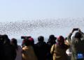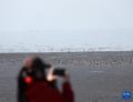 4月2日,游客在辽宁丹东鸭绿江口候鸟栖息地观看、拍摄“鸟浪”。记者 李钢 摄