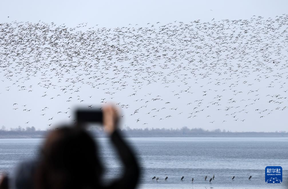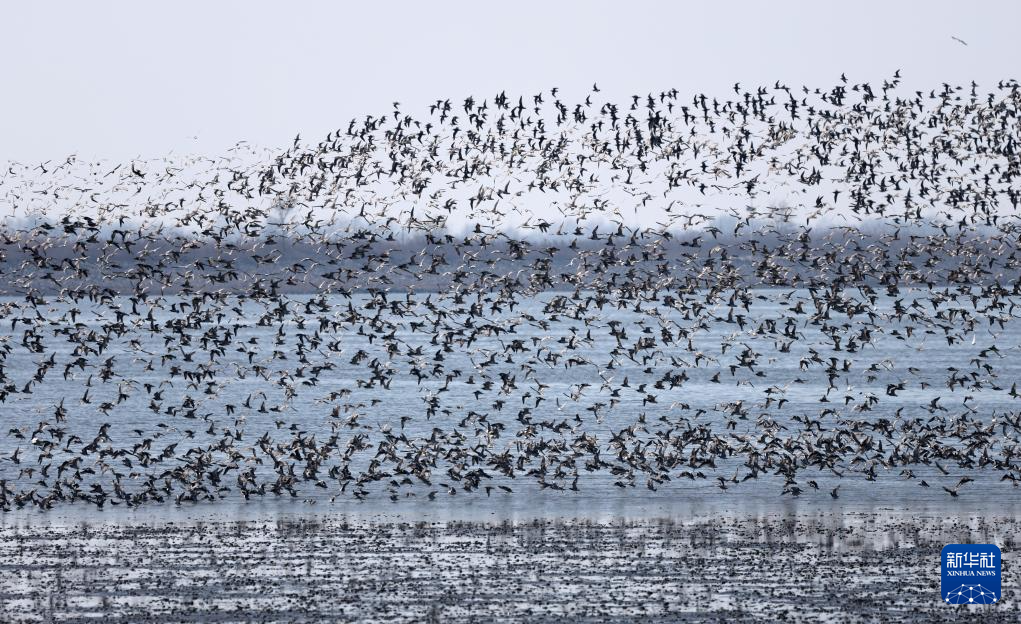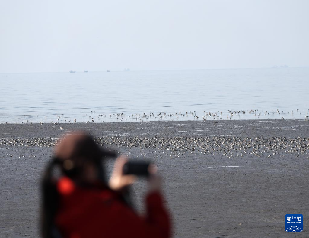 近日,辽宁丹东鸭绿江口候鸟栖息地候鸟翔集,形成“鸟浪”景观,吸引游客前来观赏。记者 李钢 摄