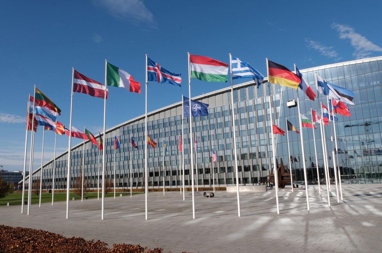 这是2025年11月5日在比利时首都布鲁塞尔拍摄的北约总部大楼外的北约及成员国旗帜。新华社记者张兆卿摄
