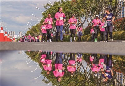 昨天,在温州市海经区樱花大道,跑者们的身影倒映水中,构成了一幅灵动而动感的春日画面。 苏巧将 摄