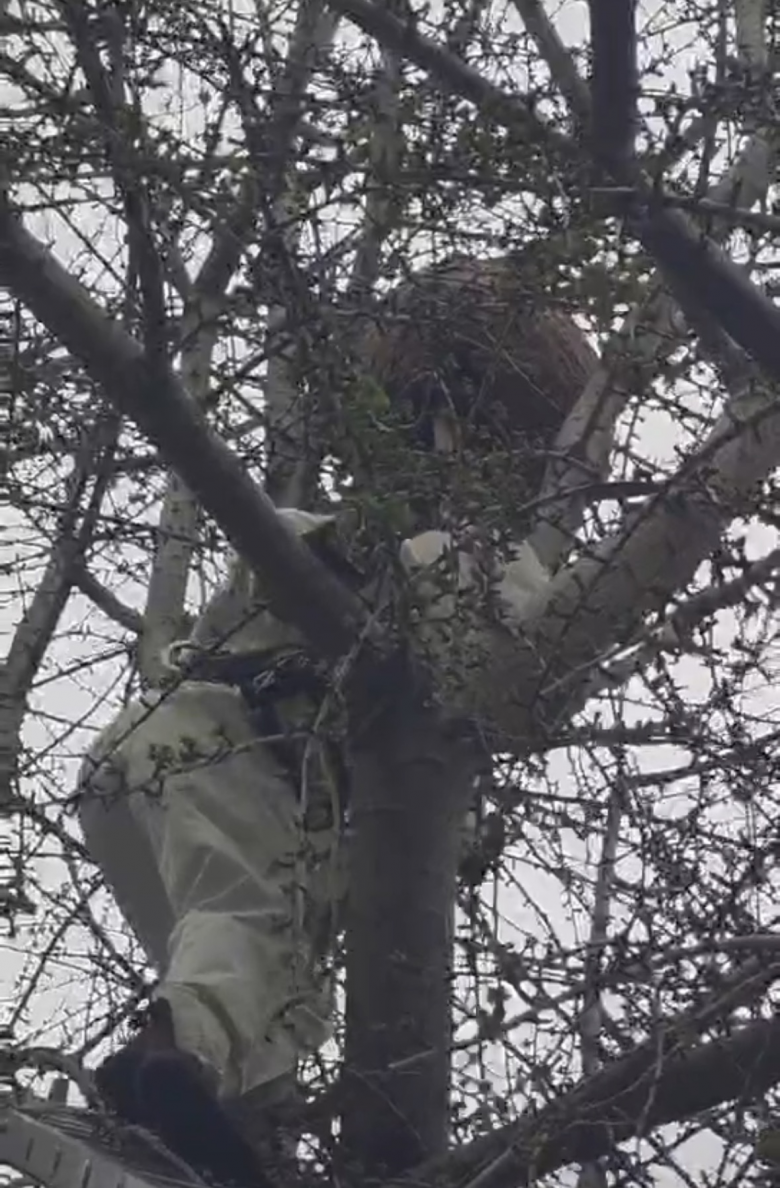 温州网讯 4月2日下午,乐清北大街太平巷一幢百年老宅内,一棵历经沧桑的百年银杏树上,十余米高的树杈间惊现巨型马蜂窝,蜂群密集盘旋,严重威胁周边居民及古树的安危。接警后,乐清市消防救援大队迅速反应,一场惊险的“云端除蜂”行动随即展开。