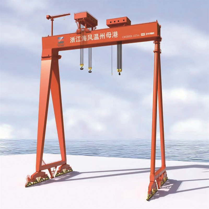 这座“巨无霸”是一台双主梁门式起重机,拥有当前全球最大起重量、最高整机高度、最高起升高度——总起重量达3800吨,跨度107米,整机高166.5米、起升高度达130米。作为浙江(华东)深远海风电母港的核心装备,它将重点服务海洋风电、海工装备、海工模块类大型钢结构部件的吊运翻身作业,为浙江构建新型能源体系、发展深远海风电产业注入强劲动能。