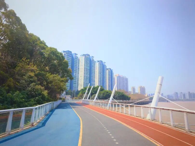 沿江绿道是市民日常散步、跑步的主要通道。原有的木地板铺装,经过多年风吹日晒,部分区域出现腐烂、翘起等问题,既影响美观,也存在安全隐患。本次将木质铺装更换为流线型蓝色渐变彩色沥青,与瓯江水面遥相呼应,形成“蓝道”视觉意象。新铺装平整舒适、防滑耐磨,无论是散步、慢跑还是轮椅通行,都更加顺畅安心。